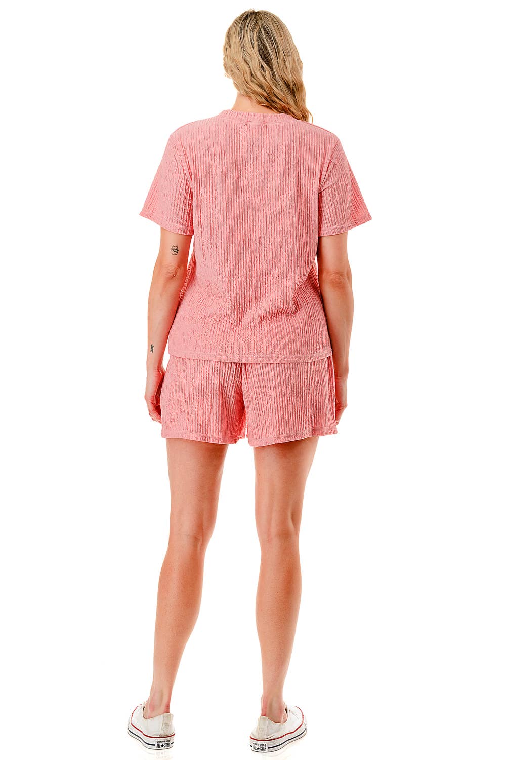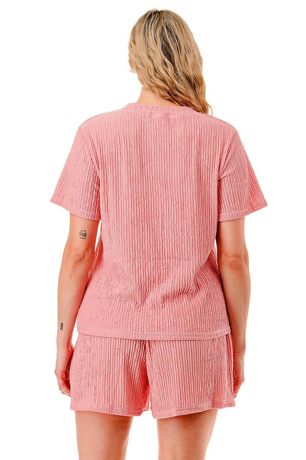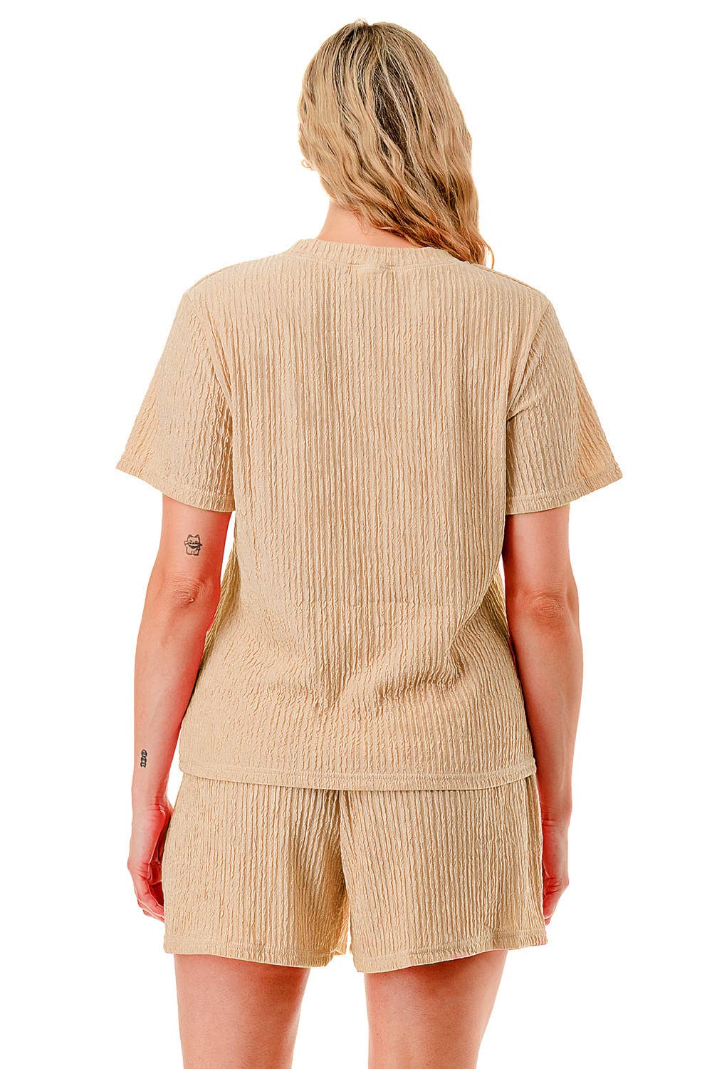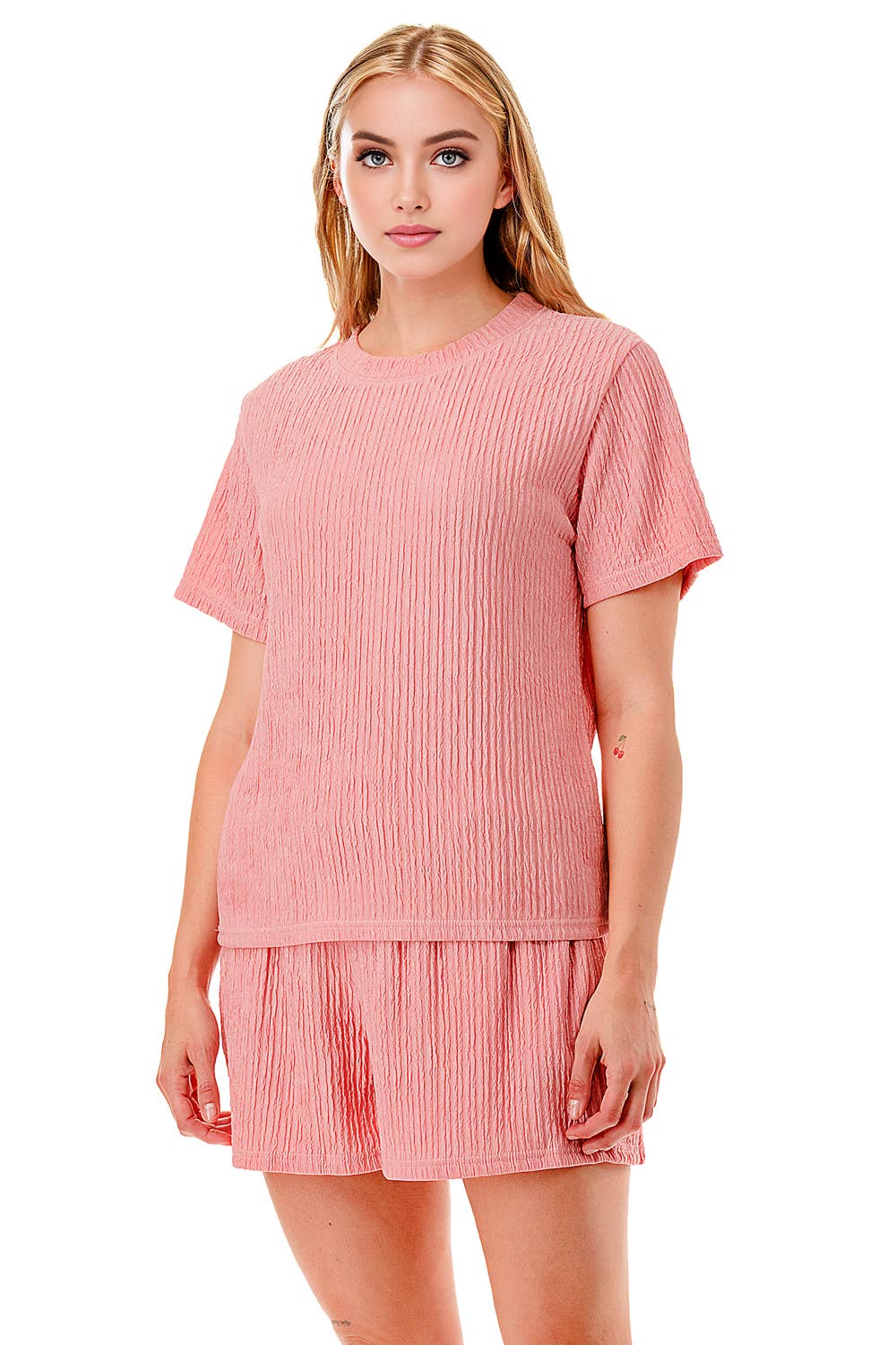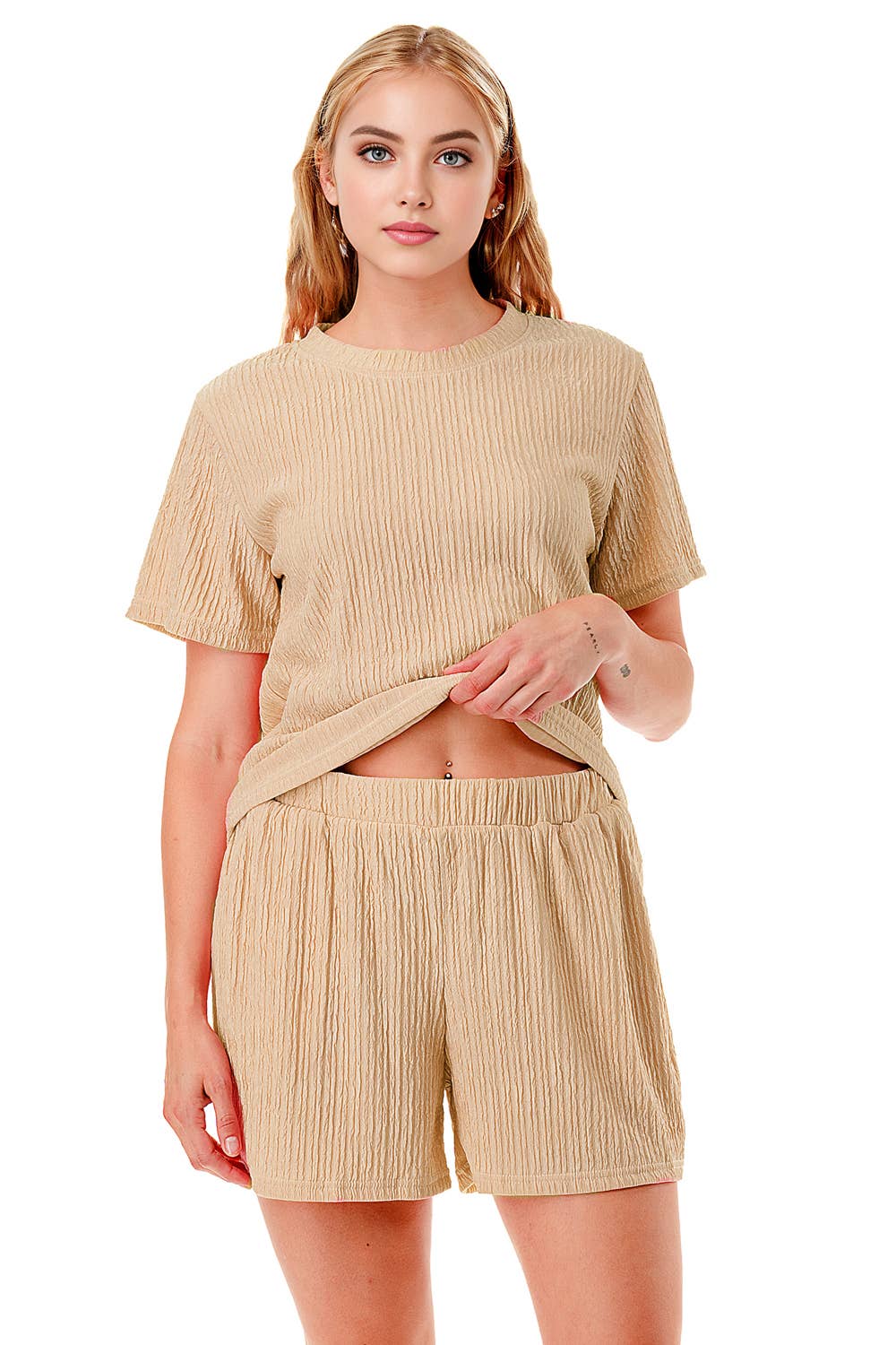 Solid color waved monochrome round neck top with shorts set